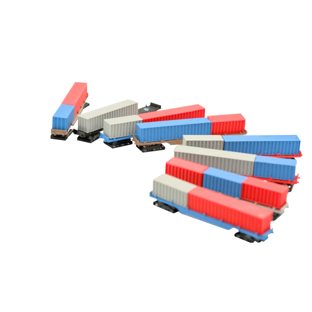 • Individuelle Gestaltung: Jeder Waggon wird mit drei TEU-Containern geliefert. Diese sind unbemalt und farblich zufällig, sodass Du Deine individuelle Note hinzufügen kannst.