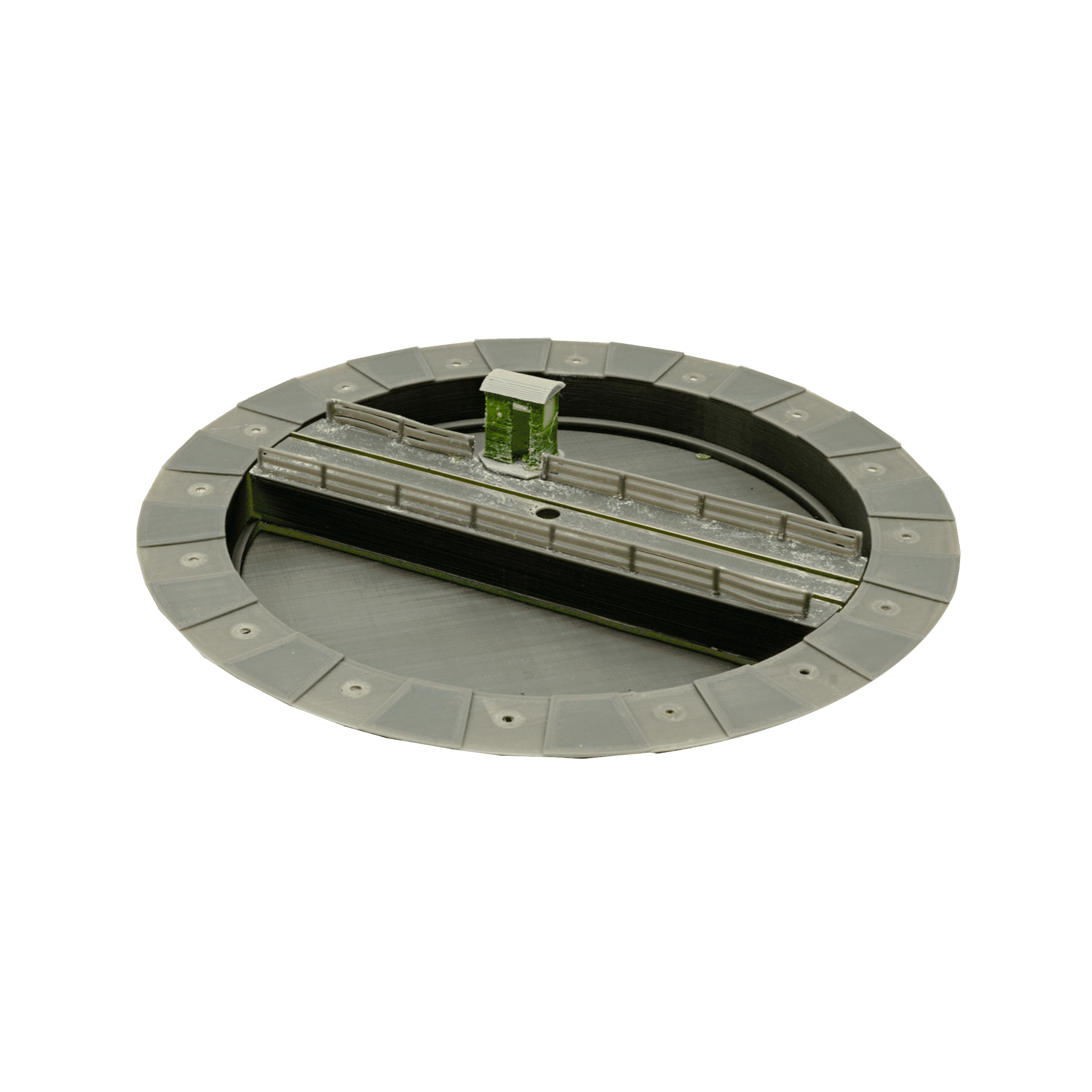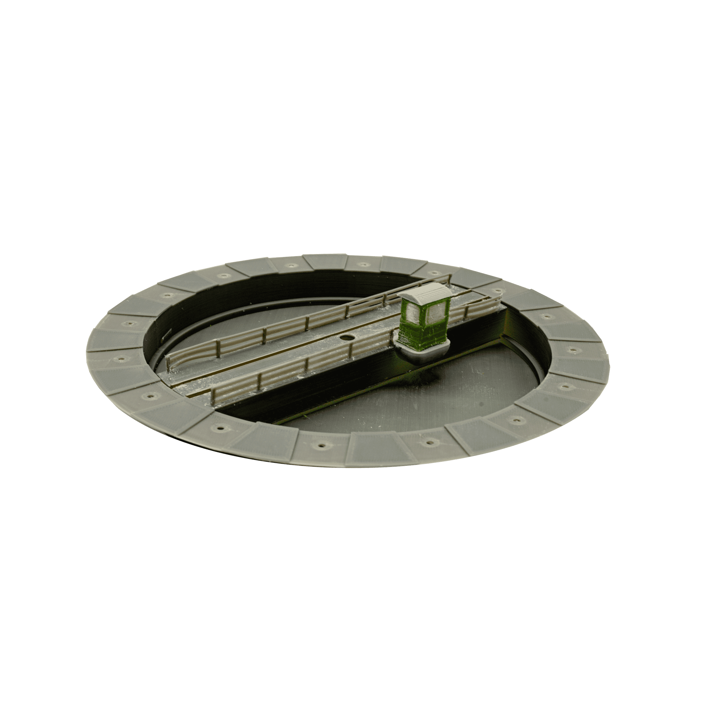 Die Lieferung erfolgt, wie auf Bild 1 und 2 gezeigt, mit Bude und Zäunen. Die Aufnahmen für die Schienenstränge sind bereits eingearbeitet. Das Modell kommt ohne Elektrik, kann jedoch nachgerüstet werden (z.B. Schleifkontakte). Die Drehscheibe ist per Hand drehbar und nicht lackiert – perfekt für individuelle Anpassungen.