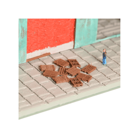 Jede Palette misst 7,5 x 5 mm, was im Maßstab 1:160 exakt den Abmessungen einer echten Europalette von 1200 x 800 mm entspricht. Die Paletten sind in drei verschiedenen Holztönen erhältlich – mittelbraun, hellbraun und dunkelbraun – um die natürliche Variation in Alterung, Verschmutzung und Feuchtigkeit realistisch darzustellen.