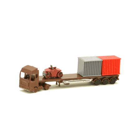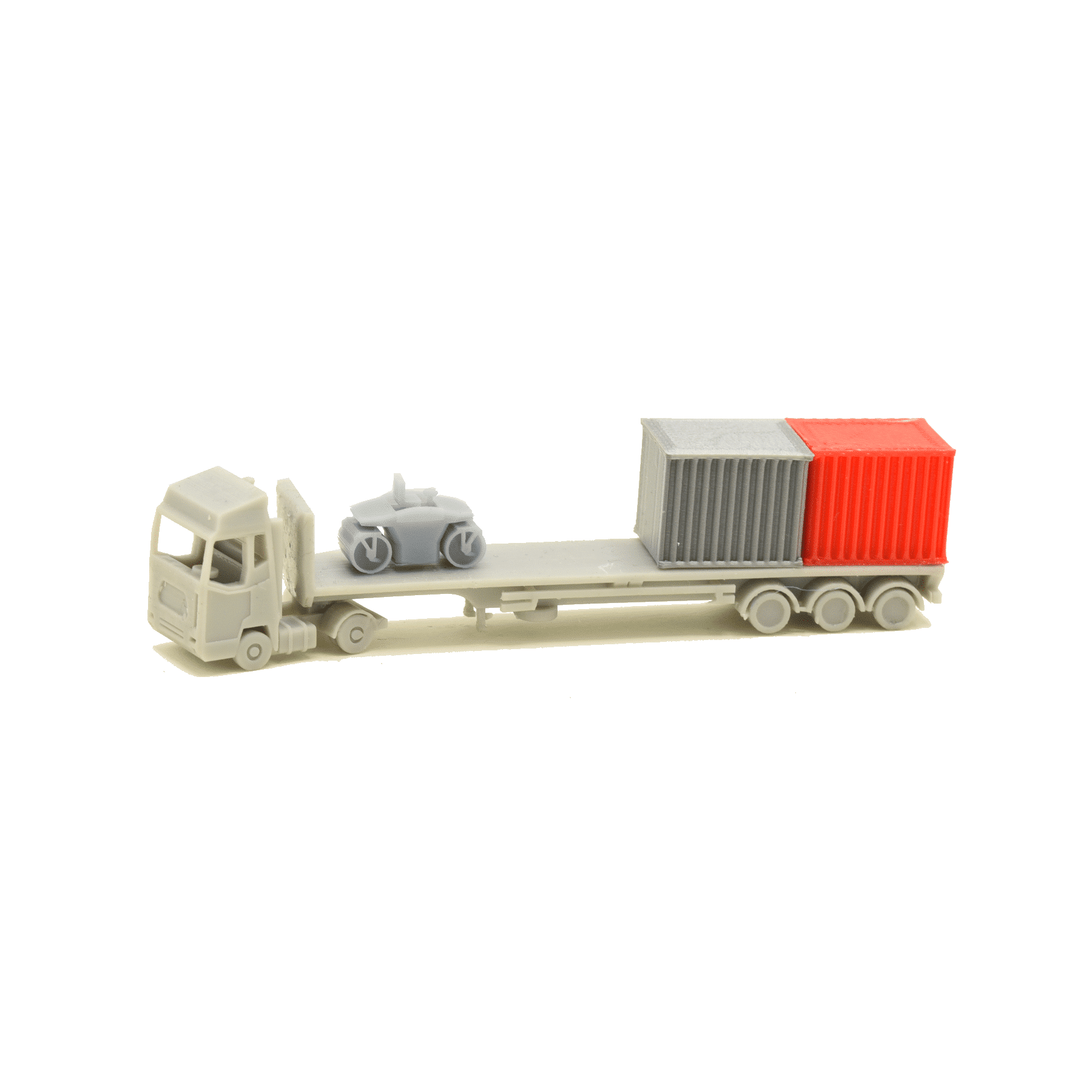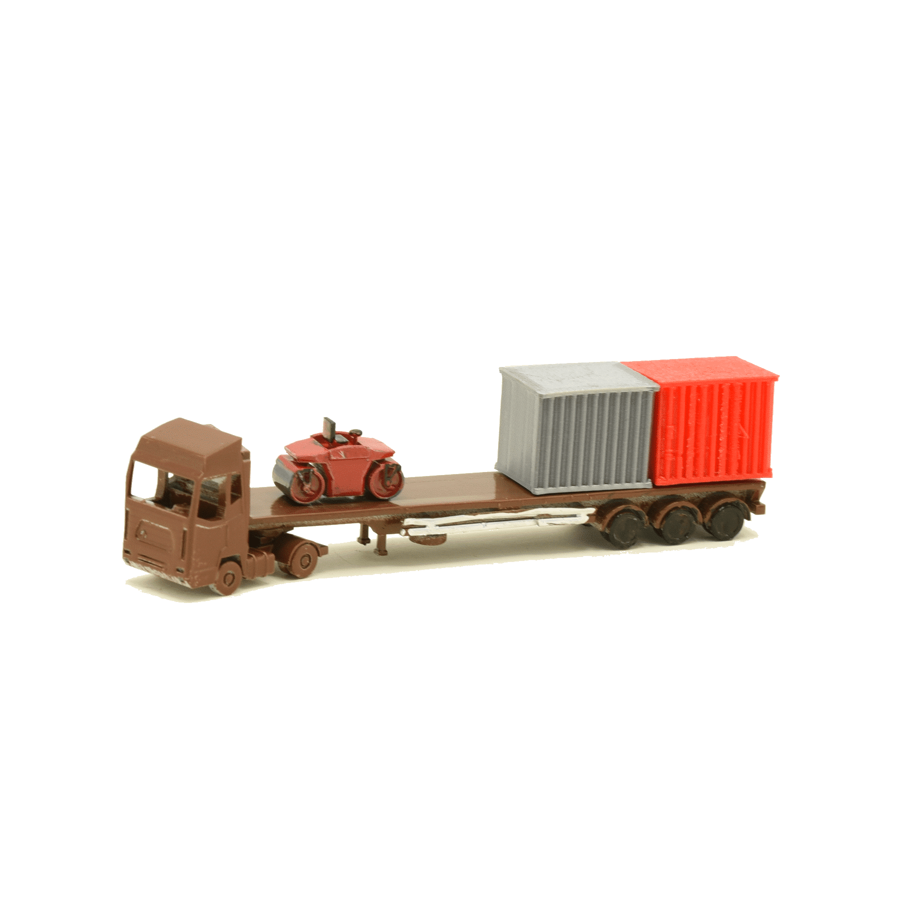 Das Set beinhaltet eine LKW Sattel-Zugmaschine, einen offenen Sattelauflieger, eine Tandemwalze klein und ein Container Kolonne Set. Die Zugmaschine, der Auflieger und die Walze sind in einem fein gearbeiteten Grauton gehalten und können nach Belieben mit Lack- und Acrylfarben bemalt werden. Die Kolonnen-Container sind silbern und rot, ebenfalls unlackiert.