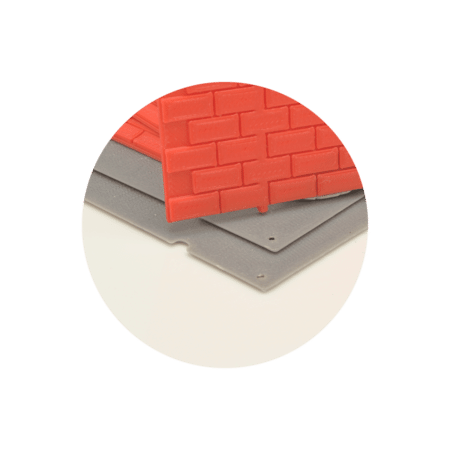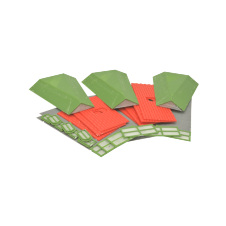 4 Seitenwände und 3 Stirnwände, alle einseitig mit eingearbeitetem Mauerwerk und mittiger Öffnung für Fenster, 7 Fenster, 6 Türelemente für 3 Doppeltüren. 2 Dach/Bodenplatte, optional 3 Dachelemente.