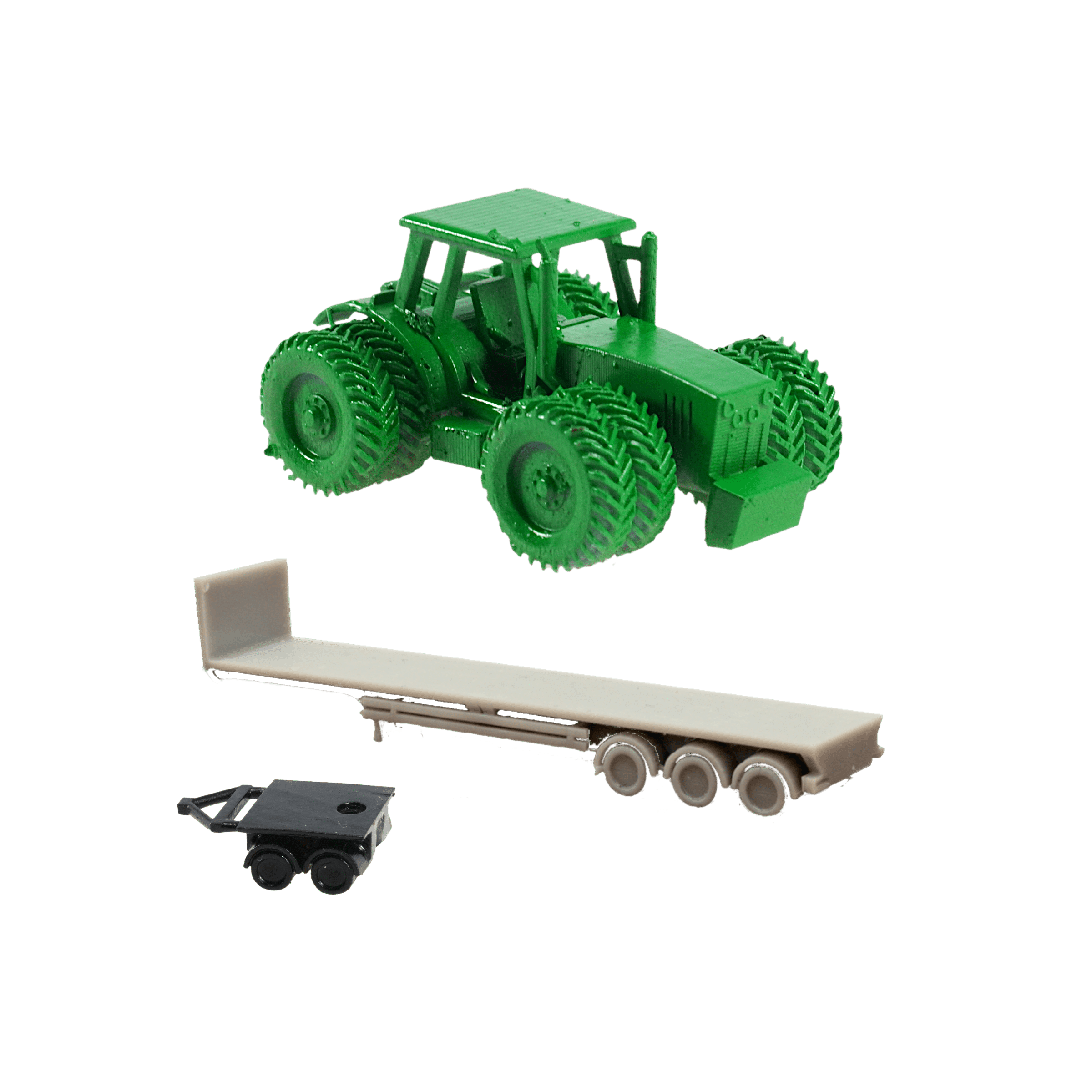 Die einfarbige Lackierung in Grün für den Traktor und Grau/Schwarz für Auflieger und Dolly bietet dir die perfekte Leinwand für deine kreative Ader. Greif zu Acrylfarbe oder Lack und verwandle das Set in dein persönliches Meisterwerk.