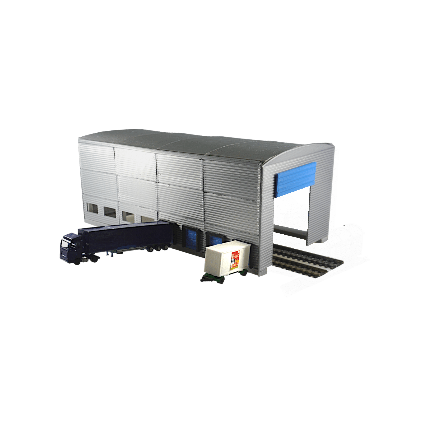 Die Halle verfügt über eine große Öffnung, die von zwei Gleisen befahren werden kann. Drei beigelegte Torelemente ermöglichen es dir, die Durchfahrt offen oder geschlossen darzustellen. Die Seitenwände kannst du nach Belieben mit Fenstern oder Laderampen gestalten.
